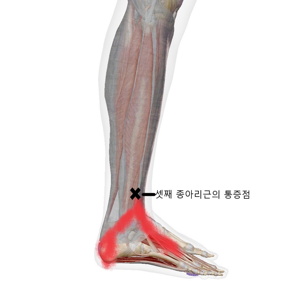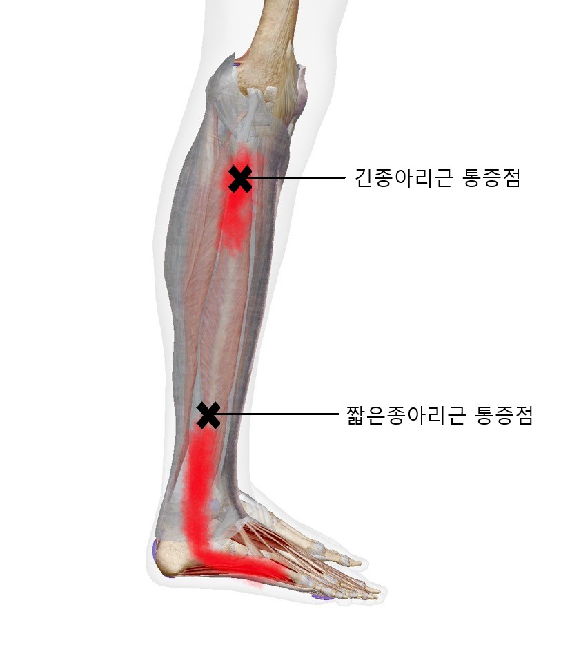 이 종아리근은 긴 종아리근(peroneus longus), 짧은 종아리근(peroneus brevis), 셋째 종아리근(peroneus tertius)으로로 구분이 되는데요. 각각의 근육마다 통증점이 생기고 근육의 문제가 생길 때 발생할 수 있는 방사통이 조금씩 다르니 하나하나 설명해드릴게요.